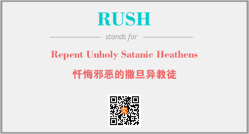上述内容是“Repent Unholy Satanic Heathens”作为“RUSH”的缩写,解释为“忏悔邪恶的撒旦异教徒”时的信息,以及英文缩略词RUSH所代表的英文单词,其对应的中文拼音、详细解释以及在英文中的流行度和相关分类、应用领域及应用示例等。