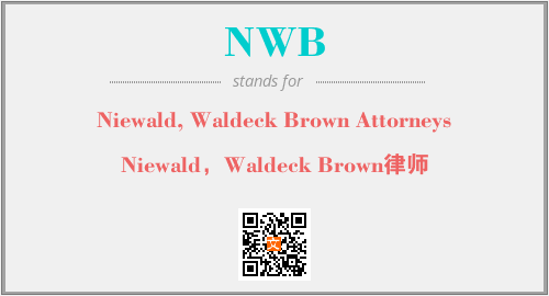 上述内容是“Niewald, Waldeck Brown Attorneys”作为“NWB”的缩写,解释为“Niewald,Waldeck Brown律师”时的信息,以及英文缩略词NWB所代表的英文单词,其对应的中文拼音、详细解释以及在英文中的流行度和相关分类、应用领域及应用示例等。