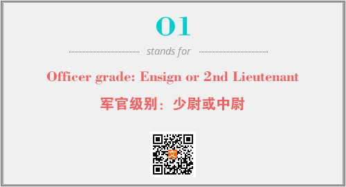 上述内容是“Officer grade: Ensign or 2nd Lieutenant”作为“O1”的缩写,解释为“军官级别:少尉或中尉”时的信息,以及英文缩略词O1所代表的英文单词,其对应的中文拼音、详细解释以及在英文中的流行度和相关分类、应用领域及应用示例等。
