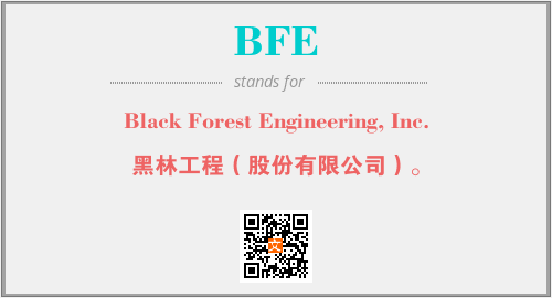 上述内容是“Black Forest Engineering, Inc.”作为“BFE”的缩写,解释为“黑林工程(股份有限公司)。”时的信息,以及英文缩略词BFE所代表的英文单词,其对应的中文拼音、详细解释以及在英文中的流行度和相关分类、应用领域及应用示例等。