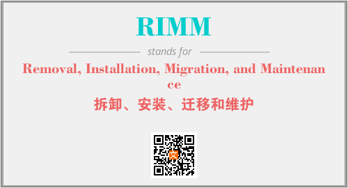 英文缩略词“RIMM”经常作为“Removal, Installation, Migration, and Maintenance”的英文缩写来使用,中文表示:“拆卸、安装、迁移和维护”。本文将详细介绍英文缩写词RIMM所代表英文单词,其对应的中文拼音、详细解释以及在英语中的流行度。此外,还有关于缩略词RIMM的分类、应用领域及相关应用示例等。