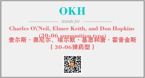 上述内容是“Charles O\'Neil, Elmer Keith, and Don Hopkins (30-06 ammunition type)”作为“OKH”的缩写,解释为“查尔斯·奥尼尔、埃尔默·基思和唐·霍普金斯(30-06弹药型)”时的信息,以及英文缩略词OKH所代表的英文单词,其对应的中文拼音、详细解释以及在英文中的流行度和相关分类、应用领域及应用示例等。