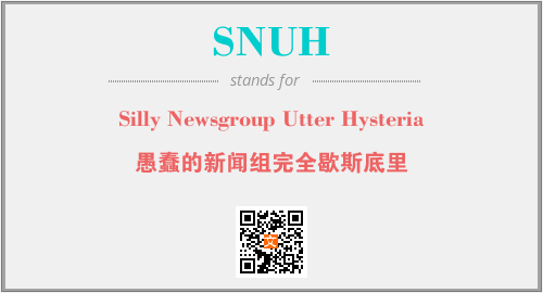 英文缩略词“SNUH”经常作为“Silly Newsgroup Utter Hysteria”的英文缩写来使用,中文表示:“愚蠢的新闻组完全歇斯底里”。本文将详细介绍英文缩写词SNUH所代表英文单词,其对应的中文拼音、详细解释以及在英语中的流行度。此外,还有关于缩略词SNUH的分类、应用领域及相关应用示例等。