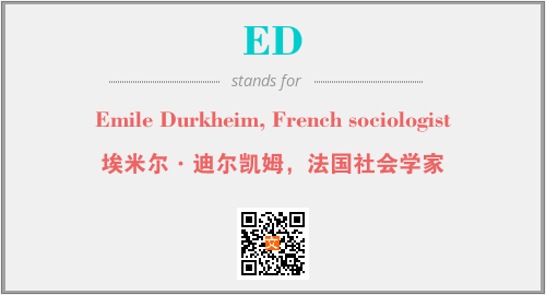 上述内容是“Emile Durkheim, French sociologist”作为“ED”的缩写,解释为“埃米尔·迪尔凯姆,法国社会学家”时的信息,以及英文缩略词ED所代表的英文单词,其对应的中文拼音、详细解释以及在英文中的流行度和相关分类、应用领域及应用示例等。