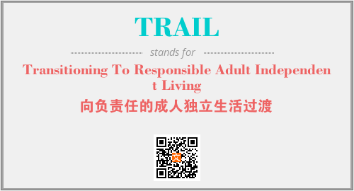 上述内容是“Transitioning To Responsible Adult Independent Living”作为“TRAIL”的缩写,解释为“向负责任的成人独立生活过渡”时的信息,以及英文缩略词TRAIL所代表的英文单词,其对应的中文拼音、详细解释以及在英文中的流行度和相关分类、应用领域及应用示例等。