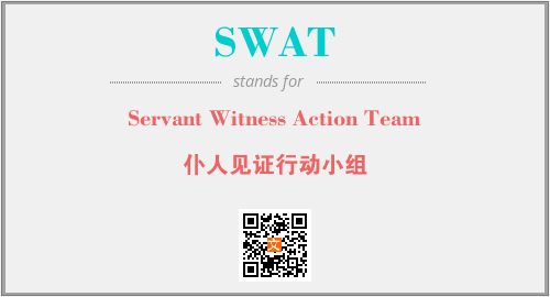英文缩略词“SWAT”经常作为“Servant Witness Action Team”的英文缩写来使用,中文表示:“仆人见证行动小组”。本文将详细介绍英文缩写词SWAT所代表英文单词,其对应的中文拼音、详细解释以及在英语中的流行度。此外,还有关于缩略词SWAT的分类、应用领域及相关应用示例等。
