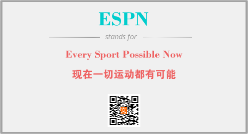 上述内容是“Every Sport Possible Now”作为“ESPN”的缩写,解释为“现在一切运动都有可能”时的信息,以及英文缩略词ESPN所代表的英文单词,其对应的中文拼音、详细解释以及在英文中的流行度和相关分类、应用领域及应用示例等。