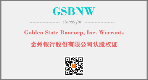 上述内容是“Golden State Bancorp, Inc. Warrants”作为“GSBNW”的缩写,解释为“金州银行股份有限公司认股权证”时的信息,以及英文缩略词GSBNW所代表的英文单词,其对应的中文拼音、详细解释以及在英文中的流行度和相关分类、应用领域及应用示例等。