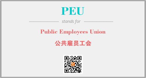 上述内容是“Public Employees Union”作为“PEU”的缩写,解释为“公共雇员工会”时的信息,以及英文缩略词PEU所代表的英文单词,其对应的中文拼音、详细解释以及在英文中的流行度和相关分类、应用领域及应用示例等。