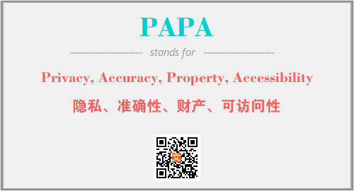 上述内容是“Privacy, Accuracy, Property, Accessibility”作为“PAPA”的缩写,解释为“隐私、准确性、财产、可访问性”时的信息,以及英文缩略词PAPA所代表的英文单词,其对应的中文拼音、详细解释以及在英文中的流行度和相关分类、应用领域及应用示例等。