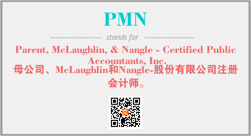 上述内容是“Parent, McLaughlin, & Nangle - Certified Public Accountants, Inc.”作为“PMN”的缩写,解释为“母公司、McLaughlin和Nangle-股份有限公司注册会计师。”时的信息,以及英文缩略词PMN所代表的英文单词,其对应的中文拼音、详细解释以及在英文中的流行度和相关分类、应用领域及应用示例等。