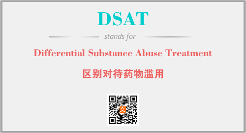 上述内容是“Differential Substance Abuse Treatment”作为“DSAT”的缩写,解释为“区别对待药物滥用”时的信息,以及英文缩略词DSAT所代表的英文单词,其对应的中文拼音、详细解释以及在英文中的流行度和相关分类、应用领域及应用示例等。