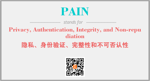 上述内容是“Privacy, Authentication, Integrity, and Non-repudiation”作为“PAIN”的缩写,解释为“隐私、身份验证、完整性和不可否认性”时的信息,以及英文缩略词PAIN所代表的英文单词,其对应的中文拼音、详细解释以及在英文中的流行度和相关分类、应用领域及应用示例等。