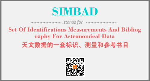 上述内容是“Set Of Identifications Measurements And Bibliography For Astronomical Data”作为“SIMBAD”的缩写,解释为“天文数据的一套标识、测量和参考书目”时的信息,以及英文缩略词SIMBAD所代表的英文单词,其对应的中文拼音、详细解释以及在英文中的流行度和相关分类、应用领域及应用示例等。