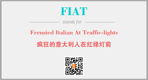 上述内容是“Frenzied Italian At Traffic-lights”作为“FIAT”的缩写,解释为“疯狂的意大利人在红绿灯前”时的信息,以及英文缩略词FIAT所代表的英文单词,其对应的中文拼音、详细解释以及在英文中的流行度和相关分类、应用领域及应用示例等。