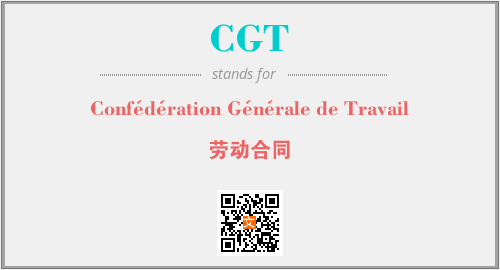 英文缩略词“CGT”经常作为“Confédération Générale de Travail”的英文缩写来使用,中文表示:“劳动合同”。本文将详细介绍英文缩写词CGT所代表英文单词,其对应的中文拼音、详细解释以及在英语中的流行度。此外,还有关于缩略词CGT的分类、应用领域及相关应用示例等。