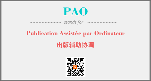 上述内容是“Publication Assistée par Ordinateur”作为“PAO”的缩写,解释为“出版辅助协调”时的信息,以及英文缩略词PAO所代表的英文单词,其对应的中文拼音、详细解释以及在英文中的流行度和相关分类、应用领域及应用示例等。