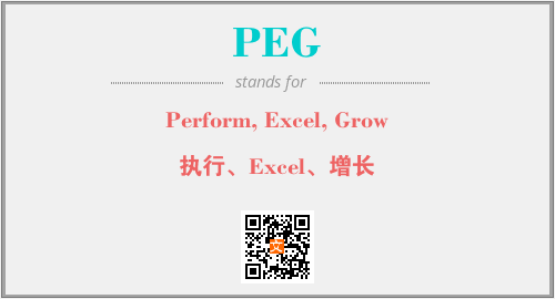 上述内容是“Perform, Excel, Grow”作为“PEG”的缩写,解释为“执行、Excel、增长”时的信息,以及英文缩略词PEG所代表的英文单词,其对应的中文拼音、详细解释以及在英文中的流行度和相关分类、应用领域及应用示例等。