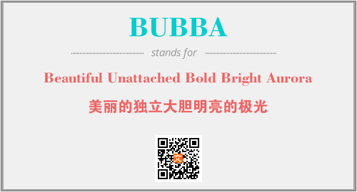 英文缩略词“BUBBA”经常作为“Beautiful Unattached Bold Bright Aurora”的英文缩写来使用,中文表示:“美丽的独立大胆明亮的极光”。本文将详细介绍英文缩写词BUBBA所代表英文单词,其对应的中文拼音、详细解释以及在英语中的流行度。此外,还有关于缩略词BUBBA的分类、应用领域及相关应用示例等。