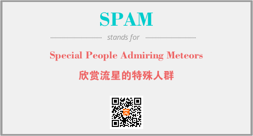 以上为Special People Admiring Meteors英文缩略词SPAM的中文解释,以及该英文缩写在英语的流行度、分类和应用领域方面的信息。