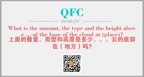 上述内容是“What is the amount, the type and the height above ... of the base of the cloud at (place)?”作为“QFC”的缩写,解释为“上面的数量、类型和高度是多少。。。云的底部在(地方)吗?”时的信息,以及英文缩略词QFC所代表的英文单词,其对应的中文拼音、详细解释以及在英文中的流行度和相关分类、应用领域及应用示例等。