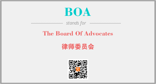 上述内容是“The Board Of Advocates”作为“BOA”的缩写,解释为“律师委员会”时的信息,以及英文缩略词BOA所代表的英文单词,其对应的中文拼音、详细解释以及在英文中的流行度和相关分类、应用领域及应用示例等。