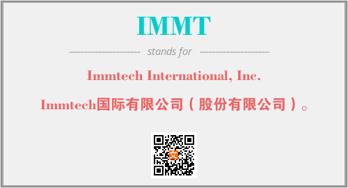 上述内容是“Immtech International, Inc.”作为“IMMT”的缩写,解释为“Immtech国际有限公司(股份有限公司)。”时的信息,以及英文缩略词IMMT所代表的英文单词,其对应的中文拼音、详细解释以及在英文中的流行度和相关分类、应用领域及应用示例等。