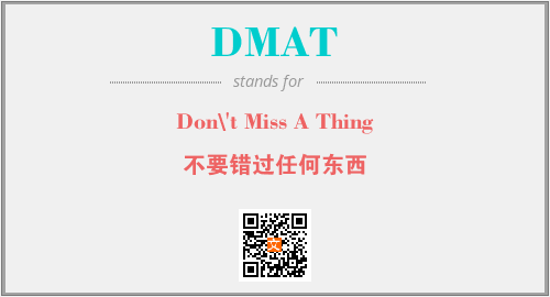 英文缩略词“DMAT”经常作为“Don\'t Miss A Thing”的英文缩写来使用,中文表示:“不要错过任何东西”。本文将详细介绍英文缩写词DMAT所代表英文单词,其对应的中文拼音、详细解释以及在英语中的流行度。此外,还有关于缩略词DMAT的分类、应用领域及相关应用示例等。