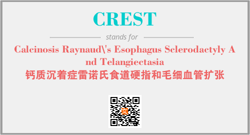 以上为Calcinosis Raynaud\'s Esophagus Sclerodactyly And Telangiectasia英文缩略词CREST的中文解释,以及该英文缩写在英语的流行度、分类和应用领域方面的信息。