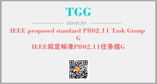 上述内容是“IEEE proposed standard P802.11 Task Group G”作为“TGG”的缩写,解释为“IEEE拟定标准P802.11任务组G”时的信息,以及英文缩略词TGG所代表的英文单词,其对应的中文拼音、详细解释以及在英文中的流行度和相关分类、应用领域及应用示例等。