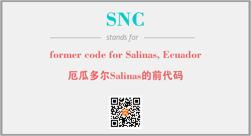 上述内容是“former code for Salinas, Ecuador”作为“SNC”的缩写,解释为“厄瓜多尔Salinas的前代码”时的信息,以及英文缩略词SNC所代表的英文单词,其对应的中文拼音、详细解释以及在英文中的流行度和相关分类、应用领域及应用示例等。
