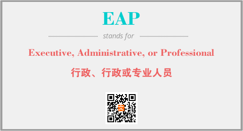 英文缩略词“EAP”经常作为“Executive, Administrative, or Professional”的英文缩写来使用,中文表示:“行政、行政或专业人员”。本文将详细介绍英文缩写词EAP所代表英文单词,其对应的中文拼音、详细解释以及在英语中的流行度。此外,还有关于缩略词EAP的分类、应用领域及相关应用示例等。