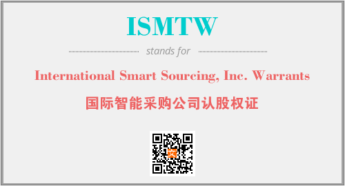 上述内容是“International Smart Sourcing, Inc. Warrants”作为“ISMTW”的缩写,解释为“国际智能采购公司认股权证”时的信息,以及英文缩略词ISMTW所代表的英文单词,其对应的中文拼音、详细解释以及在英文中的流行度和相关分类、应用领域及应用示例等。