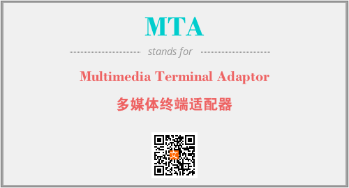 英文缩略词“MTA”经常作为“Multimedia Terminal Adaptor”的英文缩写来使用,中文表示:“多媒体终端适配器”。本文将详细介绍英文缩写词MTA所代表英文单词,其对应的中文拼音、详细解释以及在英语中的流行度。此外,还有关于缩略词MTA的分类、应用领域及相关应用示例等。