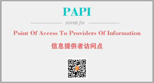 上述内容是“Point Of Access To Providers Of Information”作为“PAPI”的缩写,解释为“信息提供者访问点”时的信息,以及英文缩略词PAPI所代表的英文单词,其对应的中文拼音、详细解释以及在英文中的流行度和相关分类、应用领域及应用示例等。