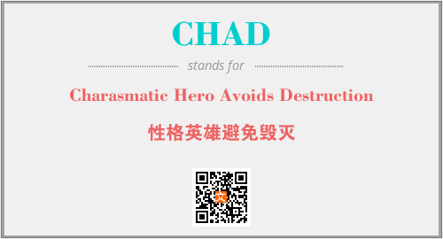 上述内容是“Charasmatic Hero Avoids Destruction”作为“CHAD”的缩写,解释为“性格英雄避免毁灭”时的信息,以及英文缩略词CHAD所代表的英文单词,其对应的中文拼音、详细解释以及在英文中的流行度和相关分类、应用领域及应用示例等。