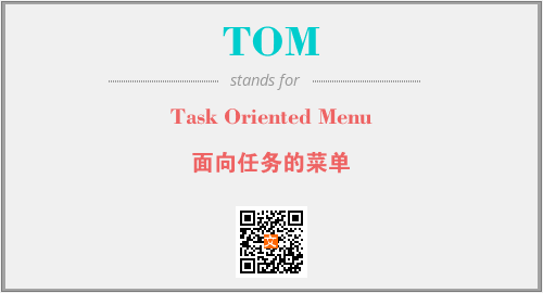 上述内容是“Task Oriented Menu”作为“TOM”的缩写,解释为“面向任务的菜单”时的信息,以及英文缩略词TOM所代表的英文单词,其对应的中文拼音、详细解释以及在英文中的流行度和相关分类、应用领域及应用示例等。