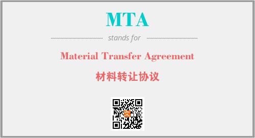 上述内容是“Material Transfer Agreement”作为“MTA”的缩写,解释为“材料转让协议”时的信息,以及英文缩略词MTA所代表的英文单词,其对应的中文拼音、详细解释以及在英文中的流行度和相关分类、应用领域及应用示例等。