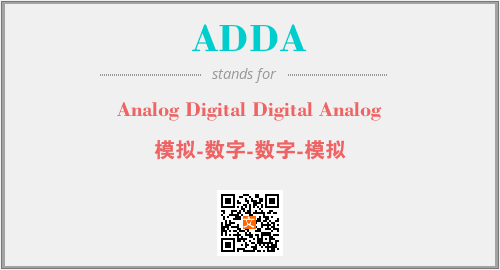 英文缩略词“ADDA”经常作为“Analog Digital Digital Analog”的英文缩写来使用,中文表示:“模拟-数字-数字-模拟”。本文将详细介绍英文缩写词ADDA所代表英文单词,其对应的中文拼音、详细解释以及在英语中的流行度。此外,还有关于缩略词ADDA的分类、应用领域及相关应用示例等。