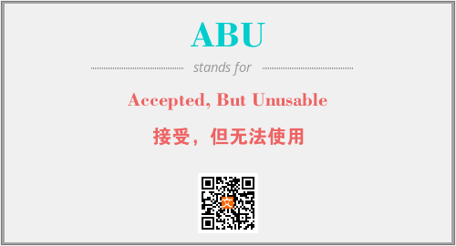 上述内容是“Accepted, But Unusable”作为“ABU”的缩写,解释为“接受,但无法使用”时的信息,以及英文缩略词ABU所代表的英文单词,其对应的中文拼音、详细解释以及在英文中的流行度和相关分类、应用领域及应用示例等。