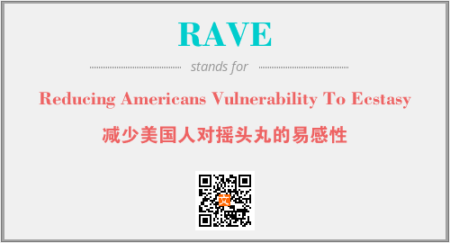 上述内容是“Reducing Americans Vulnerability To Ecstasy”作为“RAVE”的缩写,解释为“减少美国人对摇头丸的易感性”时的信息,以及英文缩略词RAVE所代表的英文单词,其对应的中文拼音、详细解释以及在英文中的流行度和相关分类、应用领域及应用示例等。