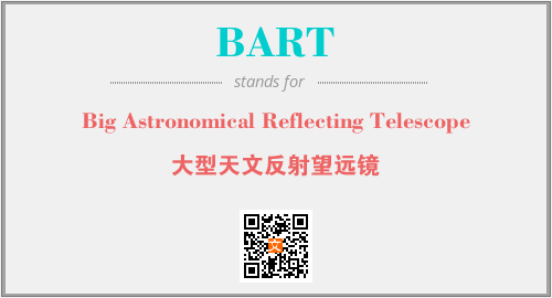 上述内容是“Big Astronomical Reflecting Telescope”作为“BART”的缩写,解释为“大型天文反射望远镜”时的信息,以及英文缩略词BART所代表的英文单词,其对应的中文拼音、详细解释以及在英文中的流行度和相关分类、应用领域及应用示例等。