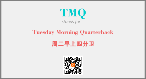 英文缩略词“TMQ”经常作为“Tuesday Morning Quarterback”的英文缩写来使用,中文表示:“周二早上四分卫”。本文将详细介绍英文缩写词TMQ所代表英文单词,其对应的中文拼音、详细解释以及在英语中的流行度。此外,还有关于缩略词TMQ的分类、应用领域及相关应用示例等。