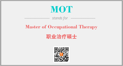 英文缩略词“MOT”经常作为“Master of Occupational Therapy”的英文缩写来使用,中文表示:“职业治疗硕士”。本文将详细介绍英文缩写词MOT所代表英文单词,其对应的中文拼音、详细解释以及在英语中的流行度。此外,还有关于缩略词MOT的分类、应用领域及相关应用示例等。