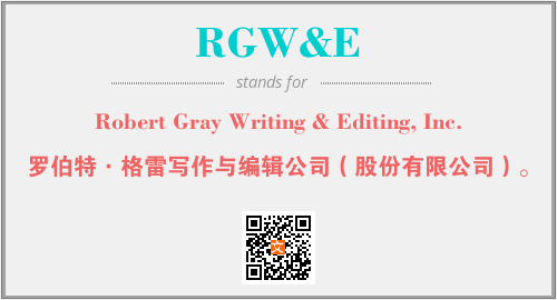 上述内容是“Robert Gray Writing & Editing, Inc.”作为“RGW&E”的缩写,解释为“罗伯特·格雷写作与编辑公司(股份有限公司)。”时的信息,以及英文缩略词RGW&E所代表的英文单词,其对应的中文拼音、详细解释以及在英文中的流行度和相关分类、应用领域及应用示例等。