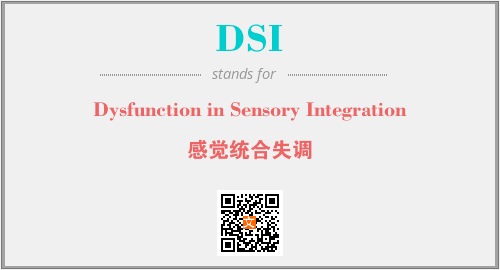 上述内容是“Dysfunction in Sensory Integration”作为“DSI”的缩写,解释为“感觉统合失调”时的信息,以及英文缩略词DSI所代表的英文单词,其对应的中文拼音、详细解释以及在英文中的流行度和相关分类、应用领域及应用示例等。