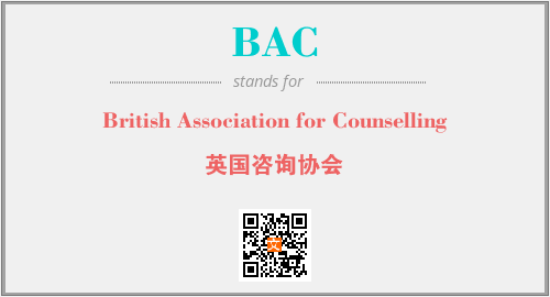 上述内容是“British Association for Counselling”作为“BAC”的缩写,解释为“英国咨询协会”时的信息,以及英文缩略词BAC所代表的英文单词,其对应的中文拼音、详细解释以及在英文中的流行度和相关分类、应用领域及应用示例等。