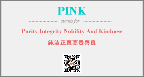上述内容是“Purity Integrity Nobility And Kindness”作为“PINK”的缩写,解释为“纯洁正直高贵善良”时的信息,以及英文缩略词PINK所代表的英文单词,其对应的中文拼音、详细解释以及在英文中的流行度和相关分类、应用领域及应用示例等。