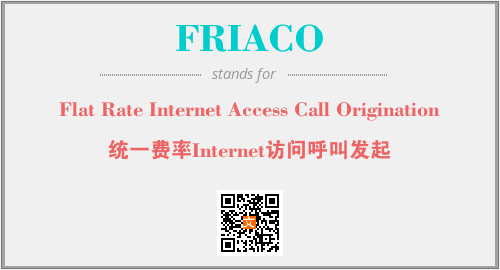 英文缩略词“FRIACO”经常作为“Flat Rate Internet Access Call Origination”的英文缩写来使用,中文表示:“统一费率Internet访问呼叫发起”。本文将详细介绍英文缩写词FRIACO所代表英文单词,其对应的中文拼音、详细解释以及在英语中的流行度。此外,还有关于缩略词FRIACO的分类、应用领域及相关应用示例等。