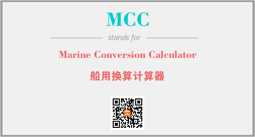 英文缩略词“MCC”经常作为“Marine Conversion Calculator”的英文缩写来使用,中文表示:“船用换算计算器”。本文将详细介绍英文缩写词MCC所代表英文单词,其对应的中文拼音、详细解释以及在英语中的流行度。此外,还有关于缩略词MCC的分类、应用领域及相关应用示例等。